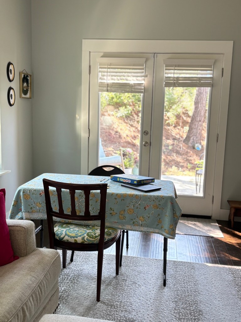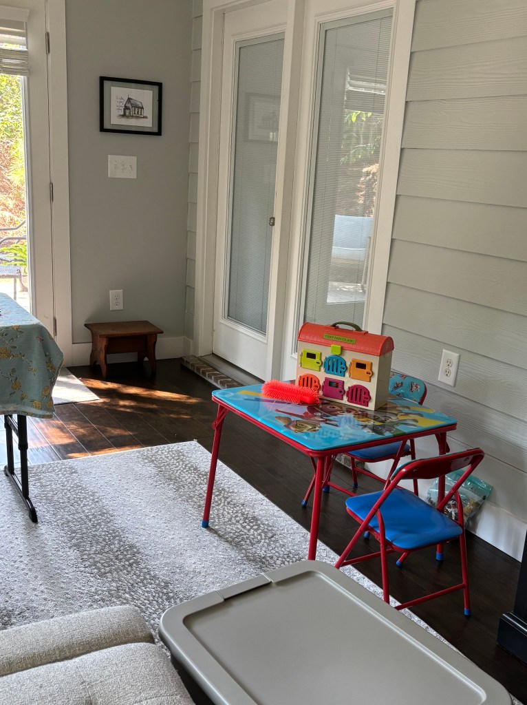 Here is the sunroom that is used for therapy. It has a separate entry and exit from the rest of my home. I love the morning sun that comes through the doors and windows!